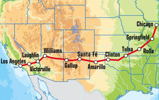 Established on November 11, 1926, Route 66 was one of the original United States highways. Starting at Lake Shore Drive in Chicago, Route 66 made its way through eight states – Illinois, Missouri, Kansas, Oklahoma, Texas, New Mexico, Arizona and California – before coming to an end in Santa Monica, CA at the Pacific Ocean. Along the way, the route passed through cities like St. Louis, Springfield, Oklahoma City, Amarillo, Albuquerque, Flagstaff and Barstow. Cafes, motor lodges, service stations, and neon-blazing tourist attractions dotted the 2,448 miles of magic through three time zones.