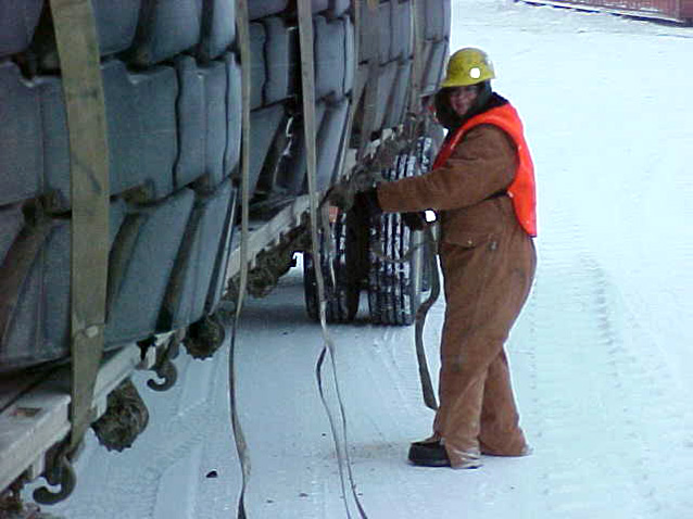 In Canada, they have a high-grade diesel fuel for the winter months, and in all the years Carla has been going up there, even when it gets down to 60 degrees below zero, she has never gelled up. Stopping at the terminal in Alberta, Doug and Wally go over her truck and belly wrap (insulate) everything on the engine. There aren’t truck stops every 20 or 30 miles when you get into that neighborhood, so your equipment has to be ready for the extreme conditions. Carla says that she would rather run up north in the winter because the rivers freeze and because they take better care of the roads then.