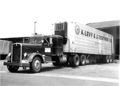 Seen here in this early 1960s picture, is a 1950s high-mount Kenworth that pulled produce for a large shipper named Levy & Zentner, an outfit which had produce facilities in many major cities throughout the West. This particular KW pictured below was painted dark green and had a red stripe that ran along the sides of the cab and sleeper. Red Rooster brand of produce was synonymous with Levy & Zentner. The rig in this picture was based out of Reno, Nevada and made weekly trips to the old Produce Market (on 8th and Central) in Los Angeles. I cannot say with any certainty what this Kenworth had for power, but most of the rigs of the 1950s had a 220 horsepower Cummins engine backed by a 5-speed main and a 3-speed auxiliary transmission (twin sticks). How many so-called “truckers” of today can handle a two-stick? I haven’t seen a Levy & Zentner rig in many years but this is not to say that they are gone. Perhaps one of my readers out there can bring me up to date on this company or even the whereabouts of this neat old KW. Please contact me at 10-4 Magazine by calling (714) 378-9990. Thanks! |