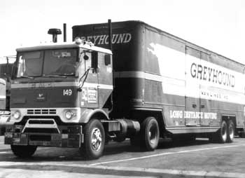 Seen here in a photo taken in 1964 at the old Enco Truckstop at Washington and Long Beach Blvd. (near downtown L.A.), is this early 60s GMC “Cracker Box” cab-over that was leased to Greyhound Van Lines, based in Chicago, Illinois. For many years, and especially in the 1950s thru the early 1970s, the “bedbug” rigs that pulled for Greyhound Van Lines were a familiar sight to see. The “Cracker Box” GMCs were a popular truck for most of the van lines, and got their name as a result of the rather square appearance that these “Jimmys” had. The “Cracker Box” was first introduced by General Motors in the late 1950s and were made up to 1967. Then in 1968, the GMC Astro 95 came out and was the replacement for the “Cracker Box”. As for Greyhound, they changed their name to Smythe Van Lines and became an important player in moving displays for the trade show industry. I don’t know if they are still doing business, but perhaps one of our readers can shed some new light on Smythe. For many years, some of the sharpest bedbug rigs had pulled for Greyhound, and in the 1960s there was a Standard Oil gas station on La Brea Avenue, north of LAX, that was home to some really cool-looking Greyhound rigs, when they needed a place to park in the L.A. area. The trailer seen here was a 40’ drop-framed Highway trailer. Greyhound Van Lines had both conventionals as well as cab-overs leased to them, and all makes and models could be found in their large fleet. |