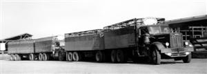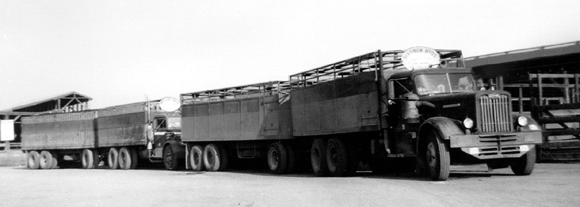 This picture, taken at the L.A. Union Stockyards in Vernon in November of 1957, depicts an Autocar and a Kenworth that just finished delivering their loads of Arizona cattle. The company, Washum Bros. Livestock Transportation of Yuma, Arizona, is still in business today, operating under the name of L.A. Yuma Freight Lines, a successful LTL carrier with late model Internationals, Freightliners and Peterbilts. I don’t know when L.A. Yuma made the transition of hauling cattle to freight, but I’m sure that it was a wise decision, as most of the Arizona cattle haulers “bit the dust” over time. Remember Calhoun Bros., Hopper, Thunderbird and Al Knudsen? They were all cattle haulers and they all are just memories. Companies that switched over into other areas of trucking and managed to change with the times are still around. L.A. Yuma is a prime example of a company that was able to adapt to a changing world. For neat old truck stuff, be sure to visit www.linerigs.com today. |