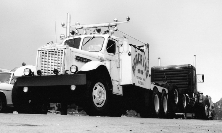 Today it is a common sight to see heavy duty wreckers and tow trucks that are dipped in chrome and adorned with fancy paint. However, there was a time, not so long ago, when there were less than a handful of heavy duty wreckers for all of Southern California. There was Hub Garage in Pomona, Bob’s Garage in Orange, Blackard’s Garage in West Covina, A-1 Towing in downtown Los Angeles, and then there was Hagerty’s Towing in East L.A. Seen here, in a 1966 photo, is the Sterling-White that Hagerty’s had back then. This truck, along with a three-axle Autocar, was their heavy duty fleet. The rest of the Hagerty’s rigs were smaller tow trucks. Though they are no longer towing big rigs, the Hagerty rigs can still be seen operating in the East L.A./Commerce area of Los Angeles. As an OPG (Official Police Garage), Hagerty’s Towing responds to calls from both the East L.A./Commerce Sheriff facilities, as well as the CHP for those areas. Colors of the Hagerty rigs are white with green and black lettering. For more neat stuff about old trucks or to purchase one of my books, be sure to visit my website at www.linerigs.com. Thanks! |
