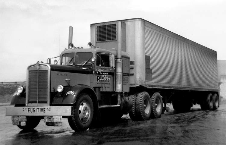 This picture, taken at the Texaco Terminal Station off Waterman Avenue in Colton, California, dates back to 1965. The truck originally started out as a 1948 LT Mack, but it was wrecked and re-kitted in 1955 into a Kenworth. Leased to Ringsby Truck Lines of Denver, John Talkington and Gene Zittle ran coast-to-coast with this KW. The rig had a 265 horsepower V-8 Cummins backed by a 5 & 3 speed for trannys. This truck was painted in the typical Ringsby colors, which were orange and black. This unit ran as far east as New York, hauling meat products one way, and then returning with produce. Though Gene Zittle is no longer with us, John Talkington and his son Wayne have become quite famous in the truck drag racing scene with their 1960’s Kenworth drag truck. Known as T-N-T Racing out of Fontana, California, the Talkington’s neat-looking blue racing truck is a real crowd-pleaser whenever there is a major truck show out West, and has won many titles and trophies while competing in various truck racing events across the country. If you’d like to see more pictures or purchase one of my books, visit www.linerigs.com today. |