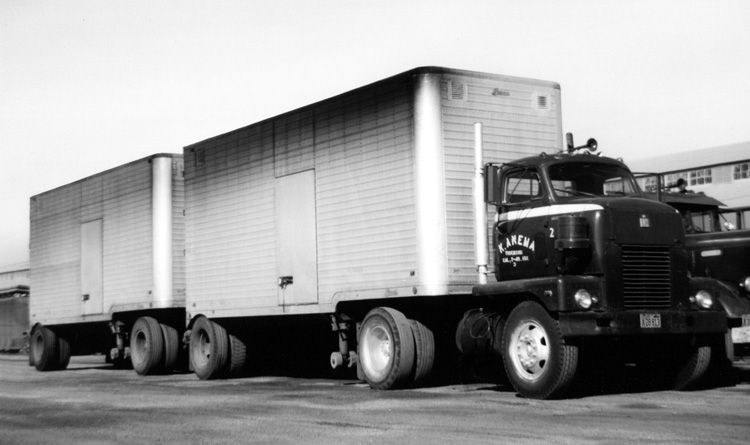 Seen in this 1963 photo is a dark blue International “Cherrypicker” owned by Kenny Anema of Pico Rivera, California. The Anema fleet consisted of various makes of trucks and hauled general freight, as well as lumber products, up and down the California coast. When this picture was taken, the Anema yard was located near the intersection of Whittier Boulevard and Paramount Boulevard. This busy location was a favorite place shared by many others in trucking. The rigs pulling for Anema were a common sight from the 1950s into the 1960s. I am not sure when this outfit exactly became part of trucking history. The trailers seen here are a set of 25-foot Brown dry vans, but many other trailers in the Anema fleet were flatbeds for hauling lumber. If any readers out there can shed more light onto this company, please contact me at the magazine by calling toll free 1-888-440-4104. Also, be sure not to forget to visit my website at www.linerigs.com today. |