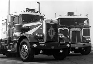 In this 1969 picture we see two of three rigs that ran coast to coast for California Industrial Products of Santa Fe Springs, California. Not in this picture was the company’s R Model Mack that had a Mercury walk-in sleeper. Colors for the fleet consisted of dark red and white. The C.I.P. rigs made weekly trips to the Detroit area hauling items for the then-booming automotive industry. Although C.I.P. is still in business, they phased out their trucking division in favor of having outside carriers do their trucking. The C.I.P. trucks were a common sight along the interstates during the 1950s through 1970s and the fleet, though it numbered only a few trucks at any given time, was always kept clean. Those lucky enough to drive for this outfit were the envy of the industry. Seen here is a 1960s Peterbilt butterfly hood conventional and in the background is a 1960s KW cabover. For more neat “old truck stuff” be sure to visit my website at www.linerigs.com. |