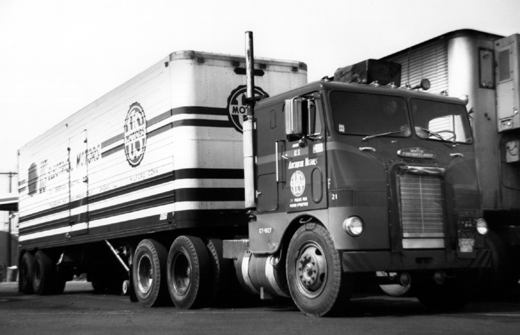 This picture was taken in 1965 at Steve’s Richfield Truck Stop on Alameda Street, north of Washington Blvd., in Los Angeles, CA. The colors of this White-Freightliner were red and blue. Pulling for U.S. Electrical Motors, who had facilities in Los Angeles, Chicago and Milford, Connecticut, this rig ran coast to coast. Chester Base of Pomona, CA leased this rig, along with others, to U.S. Electrical Motors and had a sizeable fleet of mixed makes of trucks. Chester Base hauled just about anything - you could find his rigs anywhere in the country. Cab-overs and conventionals, the Base fleet was made up of Kenworths, Peterbilts, Freightliners and other makes. I don’t know what happened to Chester Base or any of his rigs, but they were a common sight from the 1950s well into the 1960s. Anyone knowing the whereabouts of this company or any of its trucks can contact me through 10-4 at 1-888-440-4104. Check out my website at www.linerigs.com today. |